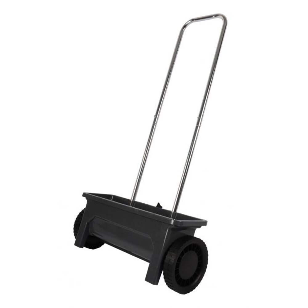 Il est à la fois pratique et ergonomique. La barre de poussée se trouve à une hauteur de 110 centimètres. Ainsi, les jardiniers moyens, comme les jeunes et les moins jeunes, trouveront la barre de poussée en métal à une hauteur agréable. En outre, les roues en plastique solide garantissent un déplacement stable et régulier sur tous les terrains et donc l'absence de crevaison, ce qui contribue à sa durabilité. Avec un diamètre de 18 centimètres, elles roulent également plus facilement que des roues plus petites. Le godet d'épandage est également en plastique solide. Il permet d'épandre par tous les temps et donc de broyer à basse température. Avec une largeur d'épandage de 45 centimètres, vous pouvez épandre rapidement de larges bandes et réaliser votre travail encore plus rapidement.