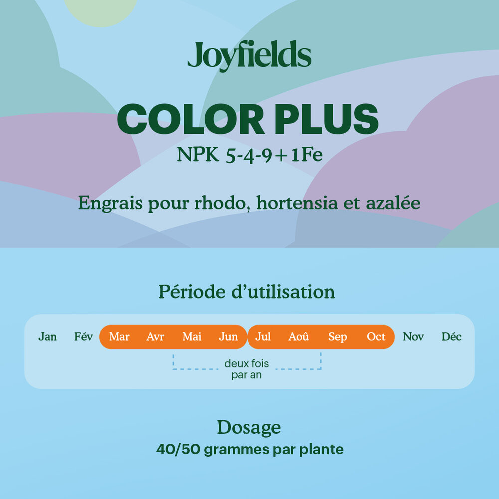 Donnez à vos plantes acidophiles la nutrition qu'elles méritent ! Color Plus a été spécialement conçu pour les rhododendrons, les azalées, les hortensias et autres plantes aimant le pH. Grâce à une formule unique riche en minéraux essentiels et en nutriments organiques, vos plantes sont nourries jusqu'à 100 jours. Le résultat ? - des racines solides, des fleurs abondantes et des feuilles d'un vert profond qui font briller votre jardin ; Grâce à l'ajout de fer, vos plantes bénéficient d'un regain de couleur et d'une protection supplémentaire contre les champignons. Cet engrais est le secret d'un jardin sain et coloré !