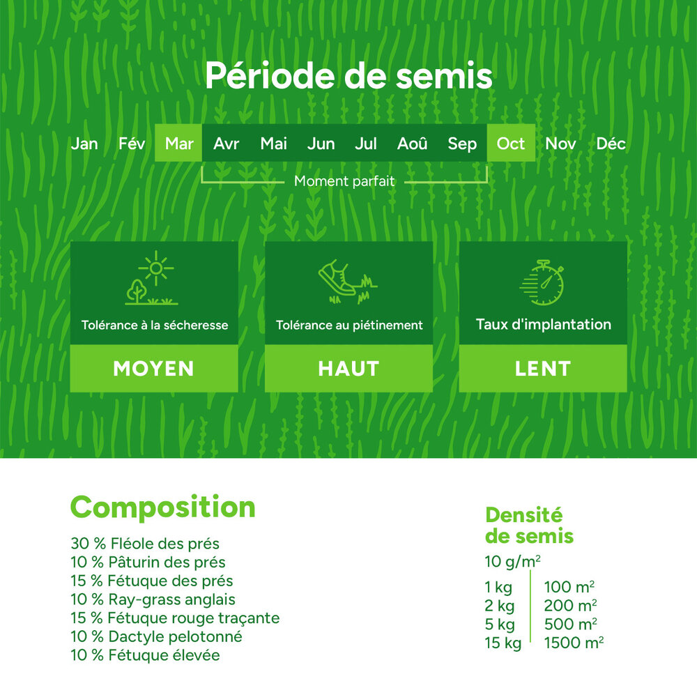 Le mélange à faible teneur en fructanes est facile à semer et convient à tous les sols. La semence peut être semée facilement avec des outils ou des machines d'épandage. Il est toutefois conseillé de débarrasser au préalable la parcelle des mauvaises herbes et de la terre. Un paquet de 15 kg suffit pour plus de 1 500 m². Ce mélange est disponible en paquets de 2 kg, 5 kg et 15 kg.