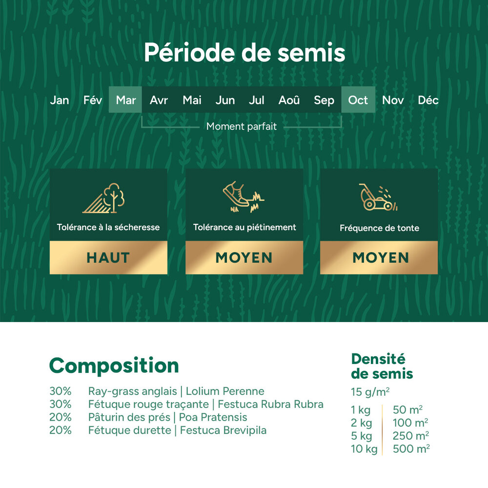 - Haute tolérance à l'ombre : les graminées de ce mélange se développent aussi bien à l'ombre qu'en plein soleil.